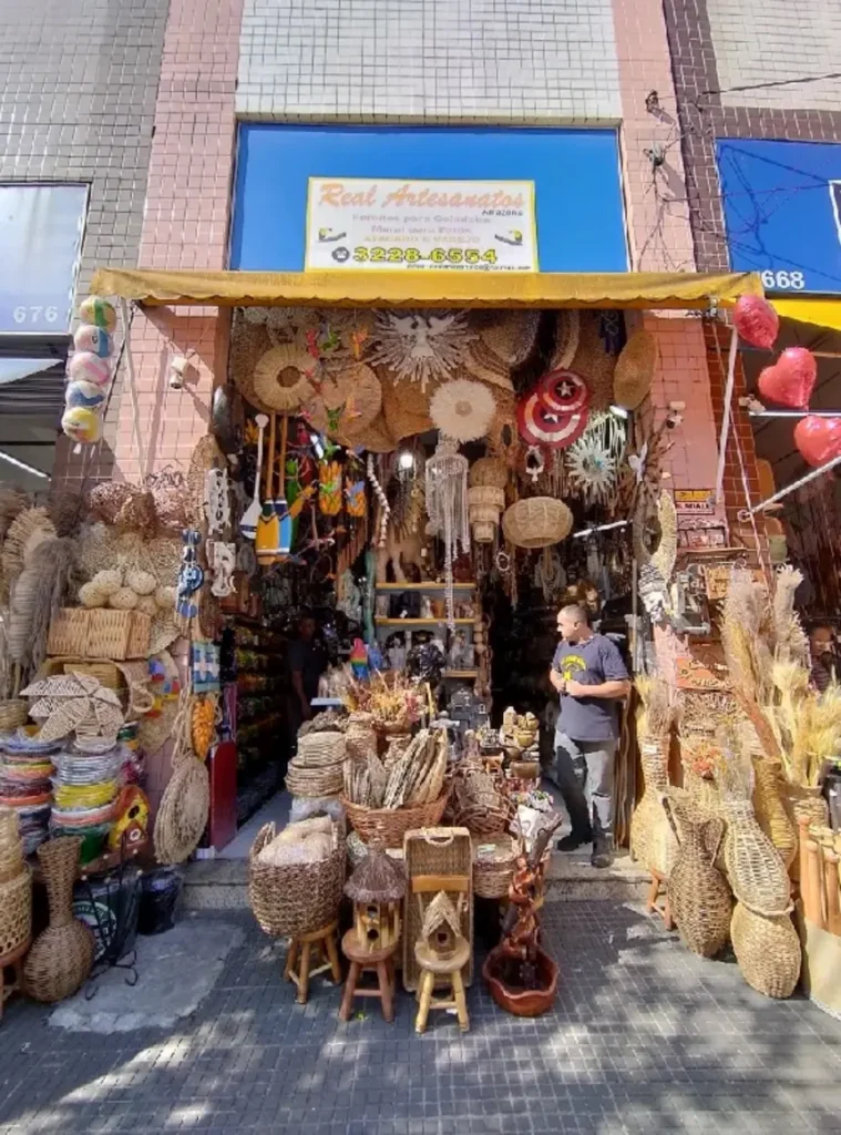 Peças artesanais brasileiras (palha, madeira) e artigos religiosos/regionais.